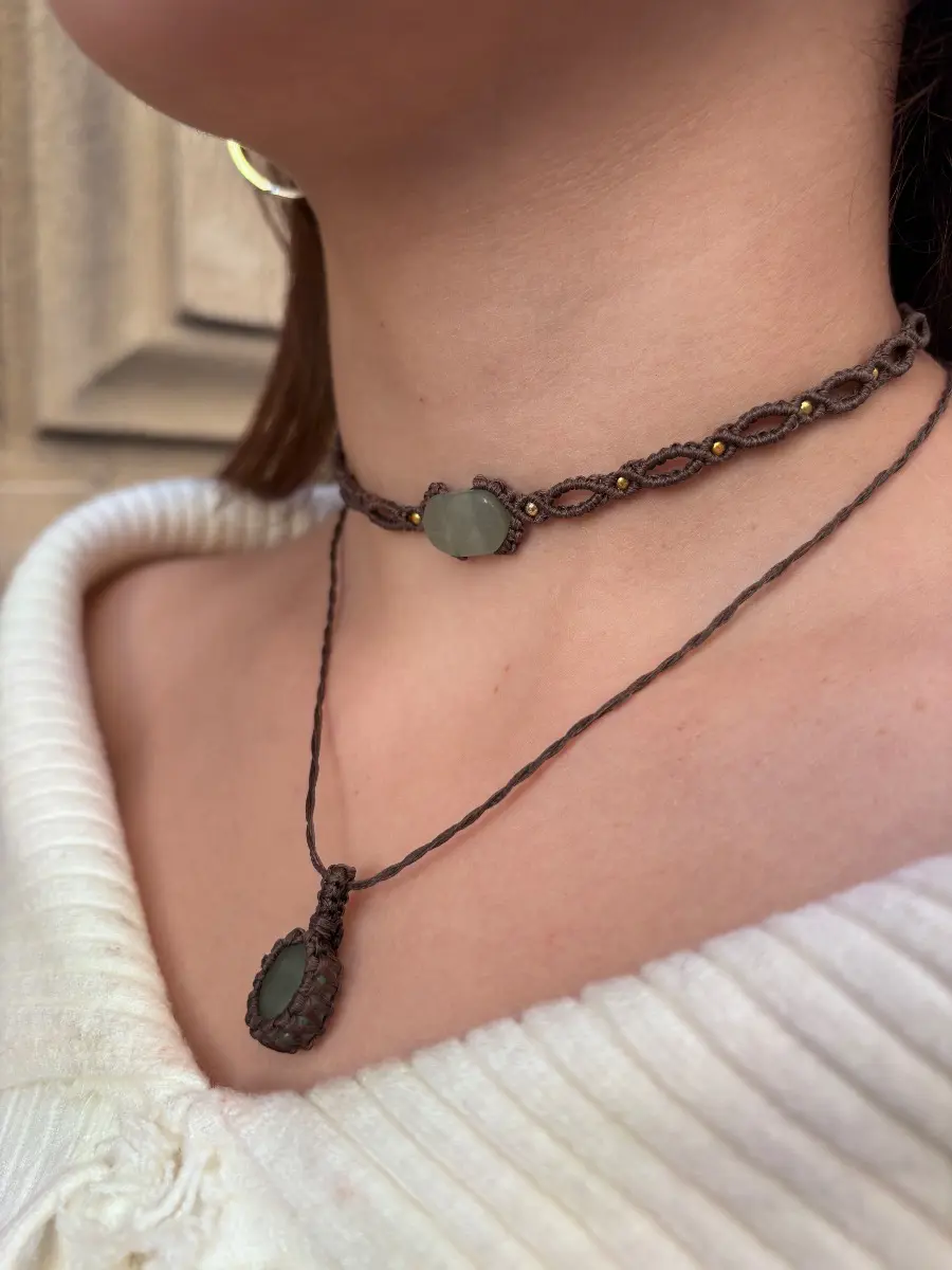 Əl işi mikro-makrame aventurin muncuqlu ikili boyunbağı🍃